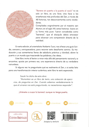 "Barrera sin puerta o la puerta al vacío" no es solo un libro, es una llave. Una llave a las enseñanzas más profundas del Zen, a través de 48 historias, tan desconcertantes como reveladoras. Compiladas originalmente por el maestro zen Mumon, en el siglo XIII, estas historias -koans en su forma más pura- fueron concebidas como "barreras", que el discípulo debía atravesar para alcanzar una comprensión directa de la realidad. En esta edición, el orientalista Norberto Tucci, nos ofrece una guía lúcida, cercana y enriquecedora, para recorrer este desafiante camino. Su traducción y sus comentarios llenos de sabiduría práctica y claridad abren la puerta a un mundo que trasciende las palabras y las ideas. Este libro invita al lector a mirar más allá del pensamiento racional y a encontrar, quizás por primera vez, una experiencia directa de su verdadera naturaleza. Si alguna vez te preguntaste qué es realmente el Zen, o si estás listo para una transformación interior auténtica, este libro te está esperando.