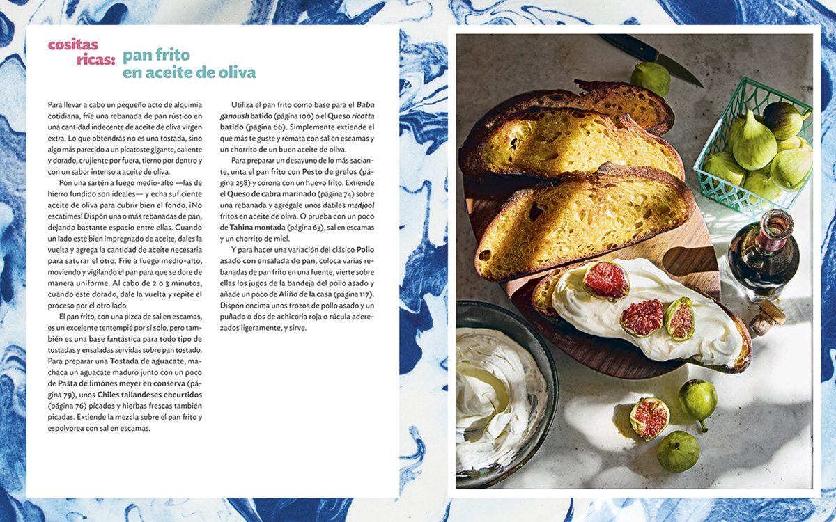 Además de descubrirte platos imprescindibles, como las tortitas de crema pastelera con ricotta, el pollo braseado con albaricoques y harissa, una focaccia altísima y esponjosa y un pastel que lleva décadas preparando y que te traslada directamente a la infancia, la autora comparte consejos y técnicas, desde cómo comprar aceite de oliva (la fecha de cosecha es fundamental) hasta cuándo derrochar en los mejores ingredientes (¡siempre en el aderezo para ensaladas!) o cuál es el único sustituto aceptable del Parmigiano Reggiano.