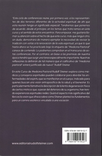 En este Curso de Medicina Pastoral Rudolf Steiner explora cómo médicos y consejeros espirituales pueden colaborar para abordar las enfermedades del espíritu que se manifiestan en el cuerpo. Indicado para quienes buscan una visión antroposófica de la salud y el bienestar. Es particularmente llamativa la descripción de la lenta degeneración física de ciertos místicos que, a pesar del deterioro de su organismo, han tenido experiencias espirituales reales. Quizá el aspecto más significativo del libro es la visión que ofrece sobre cómo Steiner planteó los fundamentos para un camino esotérico vinculado a una vocación.