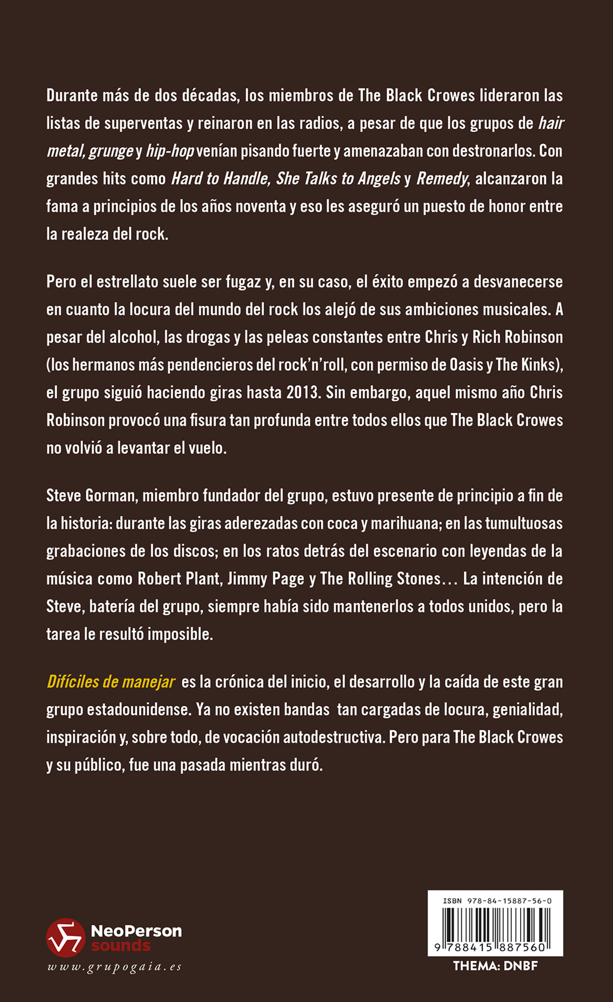 Difíciles de manejar es la crónica del inicio, el desarrollo y la caída de este gran grupo estadounidense. Ya no existen bandas tan cargadas de locura, genialidad, inspiración y, sobre todo, de vocación autodestructiva. Pero para The Black Crowes y su público, fue una pasada mientras duró.