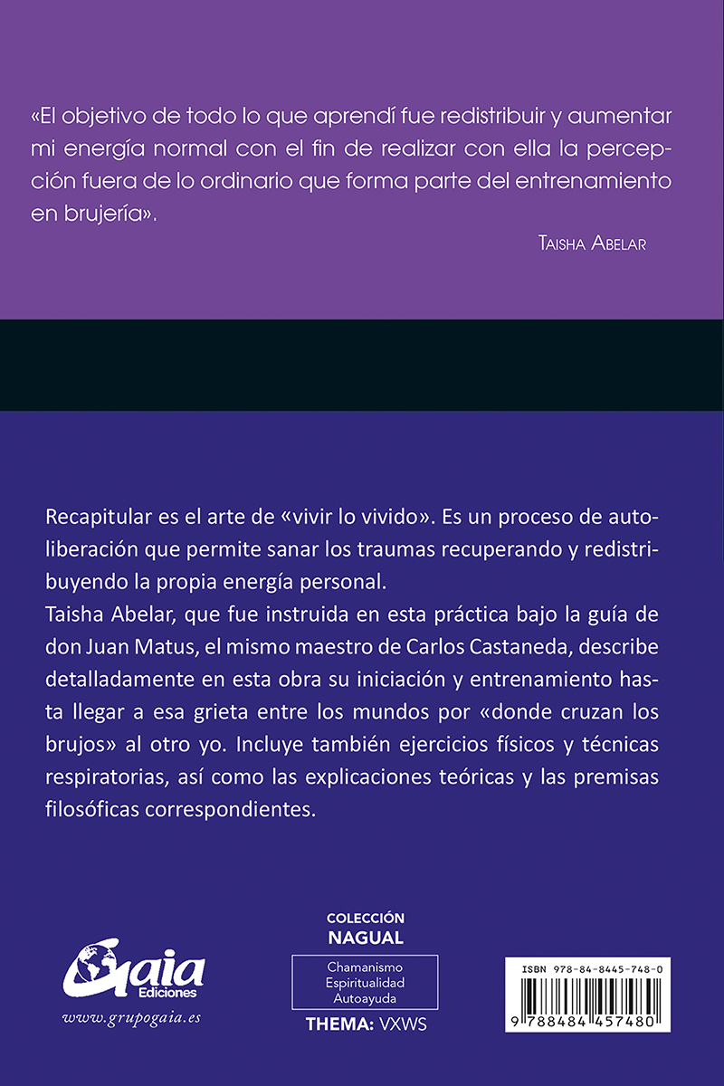 Recapitular es el arte de «vivir lo vivido». Es un proceso de autoliberación que permite sanar los traumas recuperando y redistribuyendo la propia energía personal. Taisha Abelar, que fue instruida en esta práctica bajo la guía de don Juan Matus, el mismo maestro de Carlos Castaneda, describe detalladamente en esta obra su iniciación y entrenamiento hasta llegar a esa grieta entre los mundos por «donde cruzan los brujos» al otro yo. Incluye también ejercicios físicos y técnicas respiratorias, así como las explicaciones teóricas y las premisas filosóficas correspondientes.