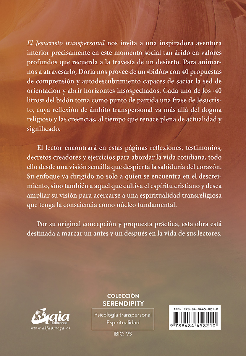 El Jesucristo transpersonal nos invita a una inspiradora aventura interior precisamente en este momento social tan árido en valores profundos que recuerda a la travesía de un desierto. Para animarnos a atravesarlo, Doria nos provee de un «bidón» con 40 propuestas de comprensión y autodescubrimiento capaces de saciar la sed de orientación y abrir horizontes insospechados. Cada uno de los «40 litros» del bidón toma como punto de partida una frase de Jesucristo, cuya reflexión de ámbito transpersonal va más allá del dogma religioso y las creencias, al tiempo que renace plena de actualidad y significado.