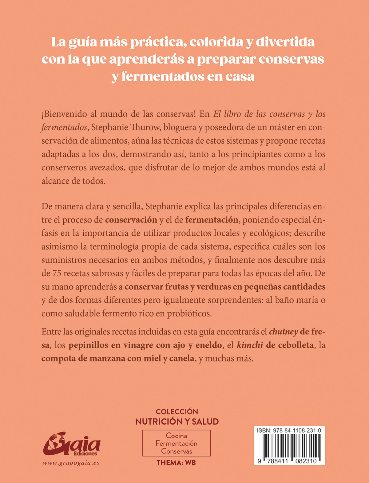 De manera clara y sencilla, Stephanie explica las principales diferencias entre el proceso de conservación y el de fermentación, poniendo especial énfasis en la importancia de utilizar productos locales y ecológicos; describe asimismo la terminología propia de cada sistema, especifica cuáles son los suministros necesarios en ambos métodos, y finalmente nos descubre más de 75 recetas sabrosas y fáciles de preparar para todas las épocas del año. De su mano aprenderás a conservar frutas y verduras en pequeñas cantidades y de dos formas diferentes pero igualmente sorprendentes: al baño maría o como saludable fermento rico en probióticos.
