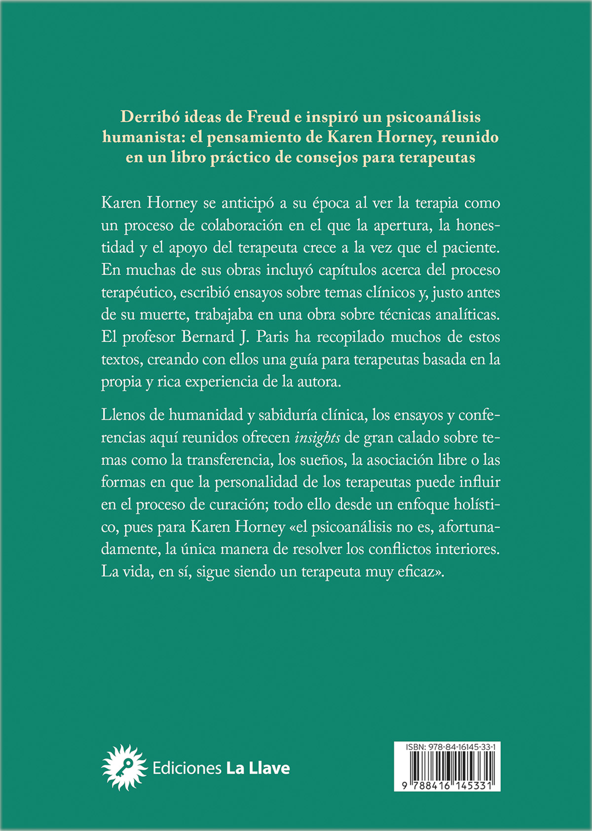 Llenos de humanidad y sabiduría clínica, los ensayos y conferencias aquí reunidos ofrecen insights de gran calado sobre temas como la transferencia, los sueños, la asociación libre o las formas en que la personalidad de los terapeutas puede influir en el proceso de curación; todo ello desde un enfoque holístico, pues para Karen Horney «el psicoanálisis no es, afortunadamente, la única manera de resolver los conflictos interiores. La vida, en sí, sigue siendo un terapeuta muy eficaz».