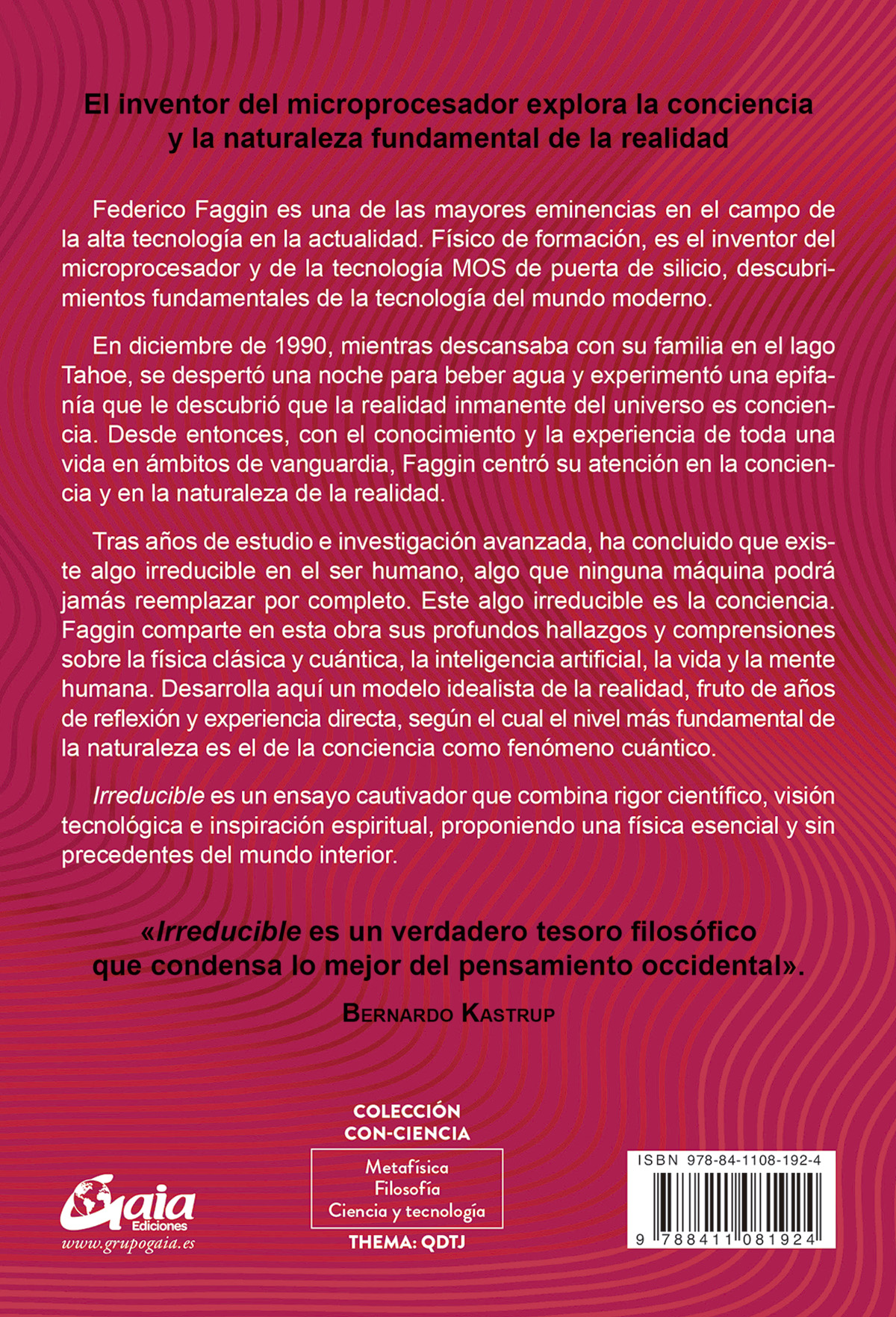 Tras años de estudio e investigación avanzada, ha concluido que existe algo irreducible en el ser humano, algo que ninguna máquina podrá jamás reemplazar por completo. Este algo irreducible es la conciencia. Faggin comparte en esta obra sus profundos hallazgos y comprensiones sobre la física clásica y cuántica, la inteligencia artificial, la vida y la mente humana. Desarrolla aquí un modelo idealista de la realidad, fruto de años de reflexión y experiencia directa, según el cual el nivel más fundamental de la naturaleza es el de la conciencia como fenómeno cuántico.