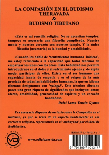 Era necesario disponer de un texto sobre la Compasión en el budismo, ya que se trata de un aspecto fundamental en esa corriente religiosa. En palabras del propio Dalai Lama: “Esta es mi sencilla religión. No se necesitan templos; tampoco es necesaria una filosofía complicada. Nuestra mente y nuestro corazón son nuestro templo. Y la única filosofía [necesaria] es la bondad y amabilidad”. Cuando les hablo de ‘sentimientos humanos básicos’, me estoy refiriendo a la capacidad que todos tenemos de empatizar los unos con los otros. Esta habilidad nos permite introducirnos en el dolor y el sufrimiento ajenos y, de algún modo, participar de ellos. Existe en el ser humano una capacidad innata de empatía y es el origen de la más preciada de todas las habilidades humanas, la que en idioma tibetano designamos con 'nyingjé’. Este término tibetano posee una gran riqueza de significados que incluyen: amor, afecto, amabilidad, generosidad de espíritu y un corazón bondadoso.