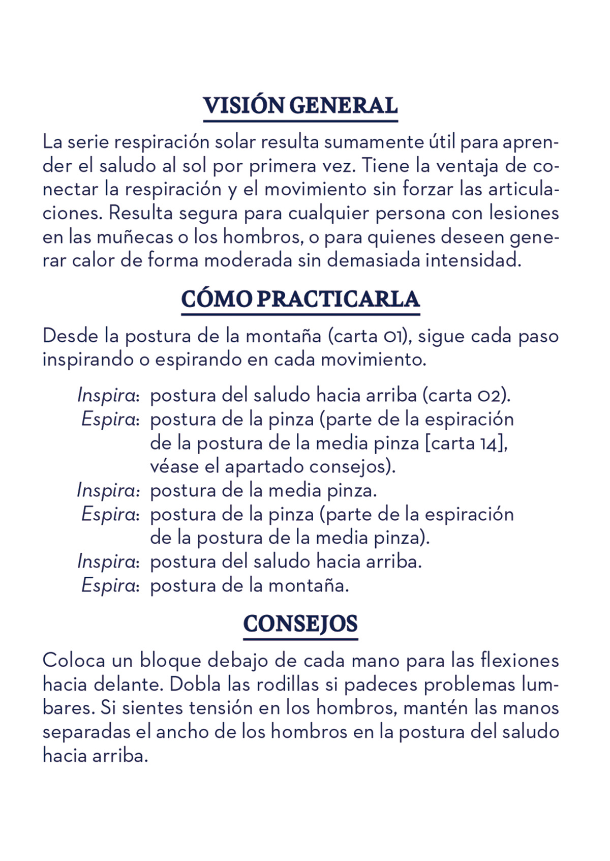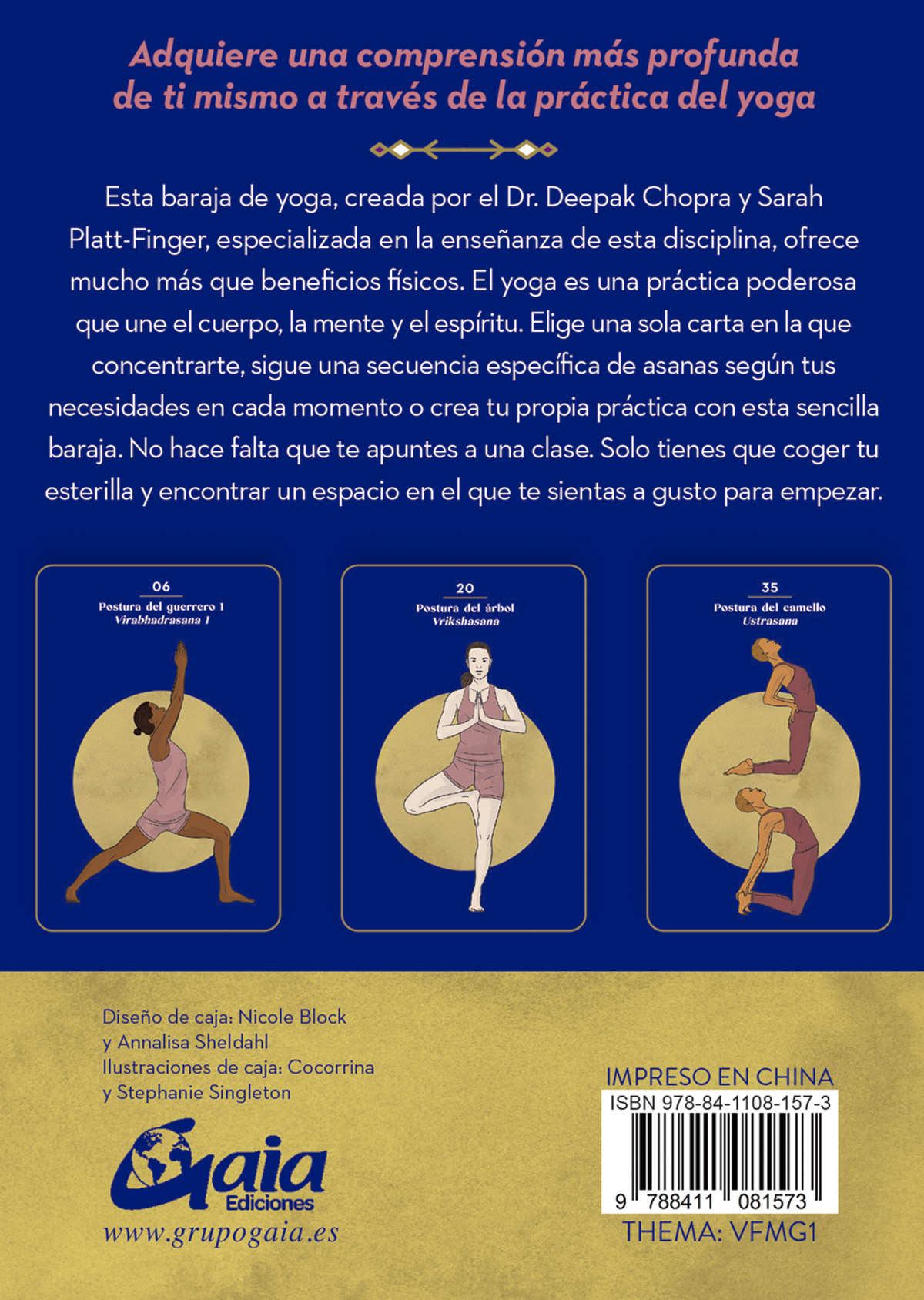 Esta baraja de yoga, creada por el Dr. Deepak Chopra y Sarah Platt-Finger, especializada en la enseñanza de esta disciplina, ofrece mucho más que beneficios físicos. El yoga es una práctica poderosa que une el cuerpo, la mente y el espíritu. Elige una sola carta en la que concentrarte, sigue una secuencia específica de asanas según tus necesidades en cada momento o crea tu propia práctica con esta sencilla baraja. No hace falta que te apuntes a una clase. Solo tienes que coger tu esterilla y encontrar un espacio en el que te sientas a gusto para empezar.