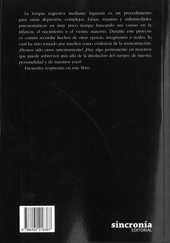 La terapia regresiva mediante hipnosis es un procedimiento para sanar depresión, complejos, fobias, traumas y enfermedades psicosomáticas en muy poco tiempo buscando sus causas en la infancia, el nacimiento o el vientre materno. Durante este proceso es común recordar hechos de otras épocas, imaginarios o reales, lo cual ha sido tomado por muchos como evidencia de la reencarnación. ¿Hemos sido nosotros anteriormente ¿Hay algo permanente en nosotros que puede sobrevivir más allá de la disolución del cuerpo, de nuestra personalidad y de nuestros yoes?