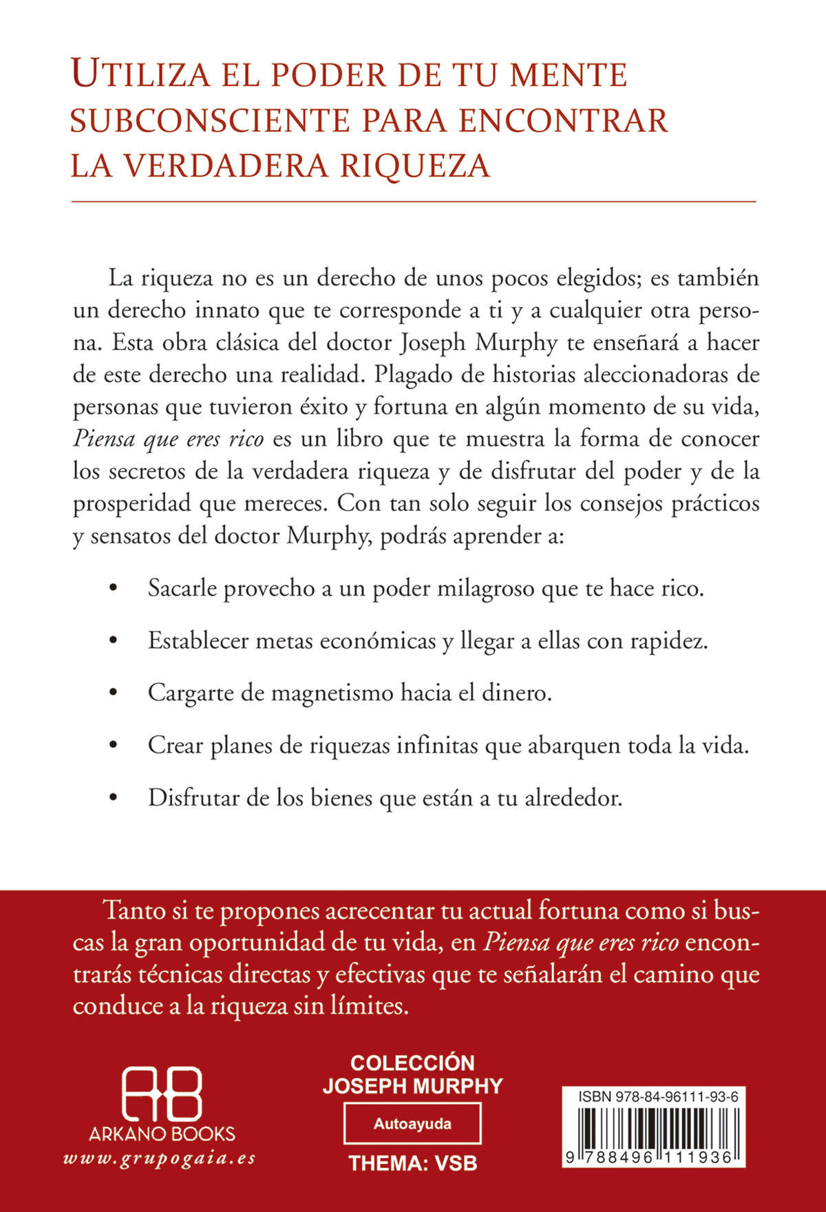 La riqueza no es un derecho de unos pocos elegidos; es también un derecho innato que te corresponde a ti y a cualquier otra persona. Esta obra clásica del doctor Joseph Murphy te enseñará a hacer de este derecho una realidad. Plagado de historias aleccionadoras de personas que tuvieron éxito y fortuna en algún momento de su vida, Piensa que eres rico es un libro que te muestra la forma de conocer los secretos de la verdadera riqueza y de disfrutar del poder y de la prosperidad que mereces. Con tan sólo seguir los consejos prácticos y sensatos del doctor Murphy, podrás aprender a: