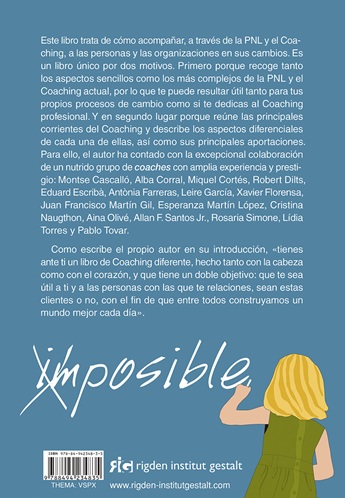 Para ello, el autor ha contado con la excepcional colaboración de un nutrido grupo de coaches con amplia experiencia y prestigio: Montse Cascalló, Alba Corral, Miquel Cortés, Robert Dilts, Eduard Escribà, Antònia Farreras, Leire García, Xavier Florensa, Juan Francisco Martín Gil, Esperanza Martín López, Cristina Naugthon, Aina Olivé, Allan F. Santos Jr., Rosaria Simone, Lídia Torres y Pablo Tovar.