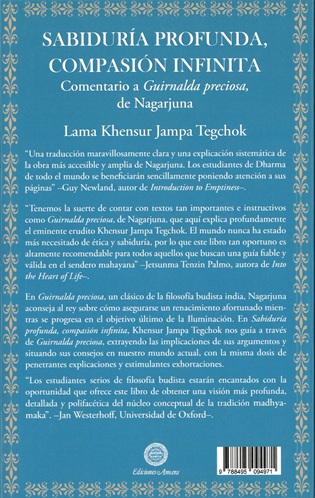 “Tenemos la suerte de contar con textos tan importantes e instructivos como Guirnalda preciosa, de Nagarjuna, que aquí explica profundamente el eminente erudito Khensur Jampa Tegchok. El mundo nunca ha estado más necesitado de ética y sabiduría, por lo que este libro tan oportuno es altamente recomendable para todos aquellos que buscan una guía fiable y válida en el sendero mahayana” – Jesunma Tenzin Palmo, autora de Intro the Heart of Life-