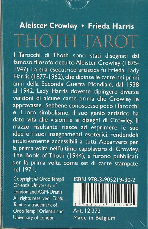 Esta es la nueva edición italiana de la baraja del Libro de Thoth, creada por el genio de Aleister Crowley -una figura misteriosa y controvertida, pero sin duda el mayor mago del siglo XX- y pintada por Lady Frieda Harris.