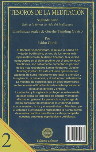 El Bodhisatvacaryavatara, la Guía a la Forma de vida del bodhisatva, es uno de los textos más representativos del budismo tibetano. Sus versos compuestos en el siglo séptimo por el erudito indio, Shantideva, son sabiamente comentados por uno de los más respetados Lamas tibetanos: Gueshe Tamding Gyatso. En este volumen aparecen tres capítulos de suma importante: proteger la atención y la vigilancia, la paciencia, y el esfuerzo o entusiasmo. La multitud de consejos que en ellos encontrarás serán de suma utilidad en la vida contemporánea, en estos años difíciles y críticos.