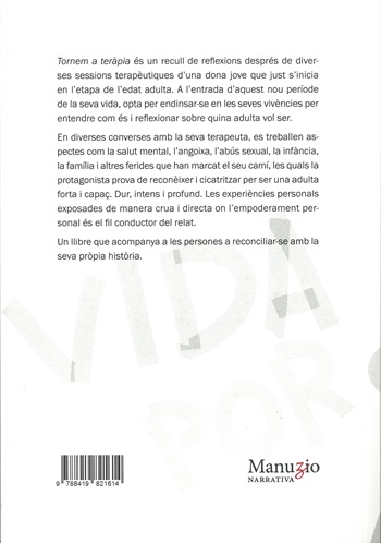 Tornem a teràpia és un recull de reflexions després de diverses sessions terapèutiques d’una dona jove que just s’inicia en l’etapa de l’edat adulta. A l’entrada d’aquest nou període de la seva vida, opta per endinsarse en les seves vivències per entendre com és i reflexionar sobre quina adulta vol ser.