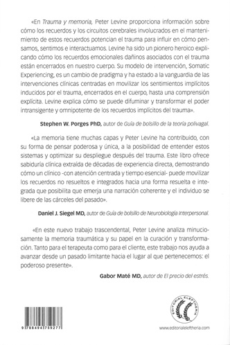 «En Trauma y memoria, Peter Levine proporciona información sobre cómo los recuerdos y los circuitos cerebrales involucrados en el mantenimiento de estos recuerdos potencian el trauma para influir en cómo pensamos, sentimos e interactuamos. Levine ha sido un pionero heroico explicando cómo los recuerdos emocionales dañinos asociados con el trauma están encerrados en nuestro cuerpo. Su modelo de intervención, Somatic Experiencing, es un cambio de pradigma y ha estado a la vanguardia de las intervenciones clínicas centradas en movilizar los sentimientos implícitos inducidos por el trauma, encerrados en el cuerpo, hasta una comprensión explícita. Levine explica cómo se puede difuminar y transformar el poder intransigente y omnipotente de los recuerdos implícitos del trauma».