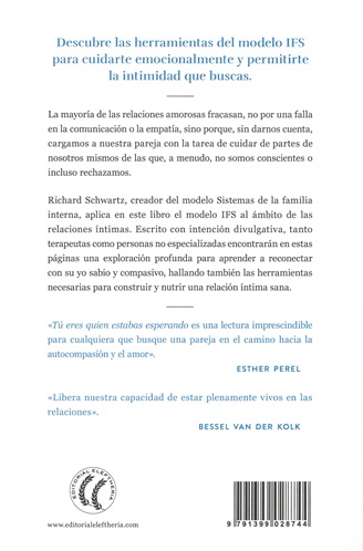 Richard Schwartz, creador de Sistemas de la familia interna, aplica en este libro el modelo IFS al ámbito de las relaciones íntimas. Escrito con intención divulgativa, tanto terapeutas como personas no especializadas encontrarán en estas páginas una exploración profunda para aprender a reconectar con su Yo sabio y compasivo, hallando también las herramientas necesarias para construir y nutrir una relación íntima sana.